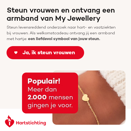 Wie vrouwen wil steunen én van sieraden houdt, krijgt nu een mooie extra reden om in actie te komen. De Hartstichting en My Jewellery slaan de handen ineen met een bijzondere actie: wie maandelijks doneert aan de Hartstichting ontvangt als dank een gratis armband van My Jewellery. Zo draag je letterlijk bij aan een beter hart voor vrouwen én draag je een stijlvol sieraad dat symbool staat voor deze steun.